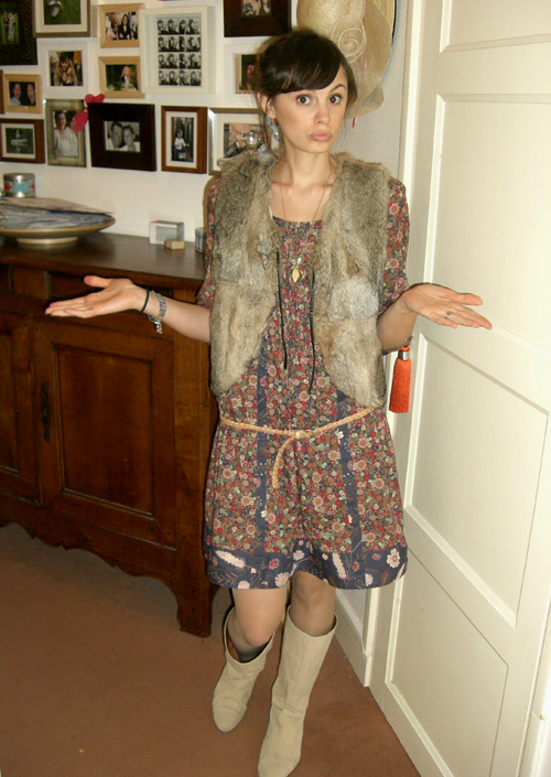 Fuck you, est-ce que je pourrais citer des extraits de ton commentaire sur mon blog, jeudi (j’ai beaucoup de mal à m’adresser à quelqu’un en lui disant fuck you, mais bon)… J’adore ta robe, Deedee, pour le gilet j’ai plus de mal, ça me fait penser à mon petit chat… Voilà, c’est du sentimentalisme, et pourtant, il y a encore quelques mois, j’aurais aimé un gilet en fourrure, mais depuis que j’ai mon chat, je ne peux plus.