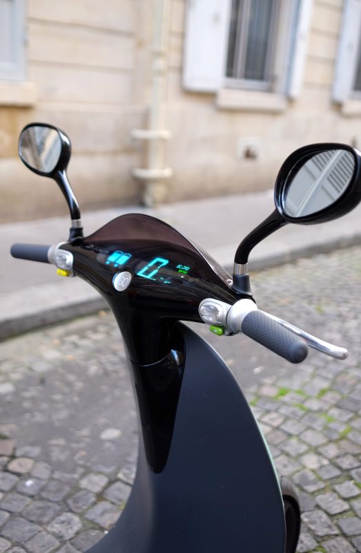 J’ai fait un petit trajet d’un gros quart d’heure pour me familiariser avec l’engin : la conduite d’un scooter électrique change très clairement de celle d’un scooter classique. Et polluant (enfin, sur la question de la pollution, j’aimerais quand même savoir comment se recyclées ou traitées les batteries au lithium utilisées par tous les véhicules électriques, mais c’est un autre sujet). J’ai plutôt apprécié l’exercice : sans surprise, le scooter a plus de pêche, il est plus réactif, plus « nerveux » que le mien, ce qui me plait bien, malgré un petit délai de quelques millièmes de secondes de latence au démarrage, comme les Autolib que je conduis de temps en temps. Je ne suis pas assez calée sur le sujet pour l’affirmer mais on pourrait peut-être en déduire que ce sont les véhicules électriques qui réagissent comme ça ? (Je vais me recycler en journaliste auto-moto) (ok, il y a encore du boulot…!). Mon trajet terminé, je l’ai garé, j’ai coupé le contact et mis fin à la location via l’appli. Et puis c’est tout.