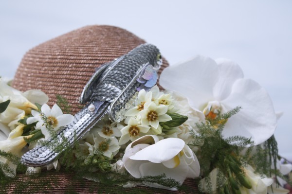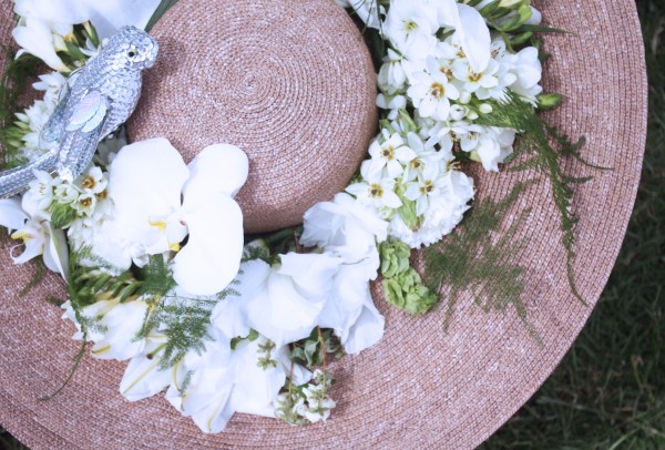 En l’occurrence, j’avais choisi une capeline chez my beloved Mademoiselle Chapeaux, qui propose des chapeaux et bibis en location. Marie, l’une des deux Mademoiselle Chapeaux, m’avait gentiment proposé de le customiser, un service sur-mesure proposé à toutes les clientes. Mais j’avais dans l’idée d’aller un peu plus loin dans le foufou. Une couronne de fleurs et un perroquet en strass plus tard, je l’avais, mon chapeau.