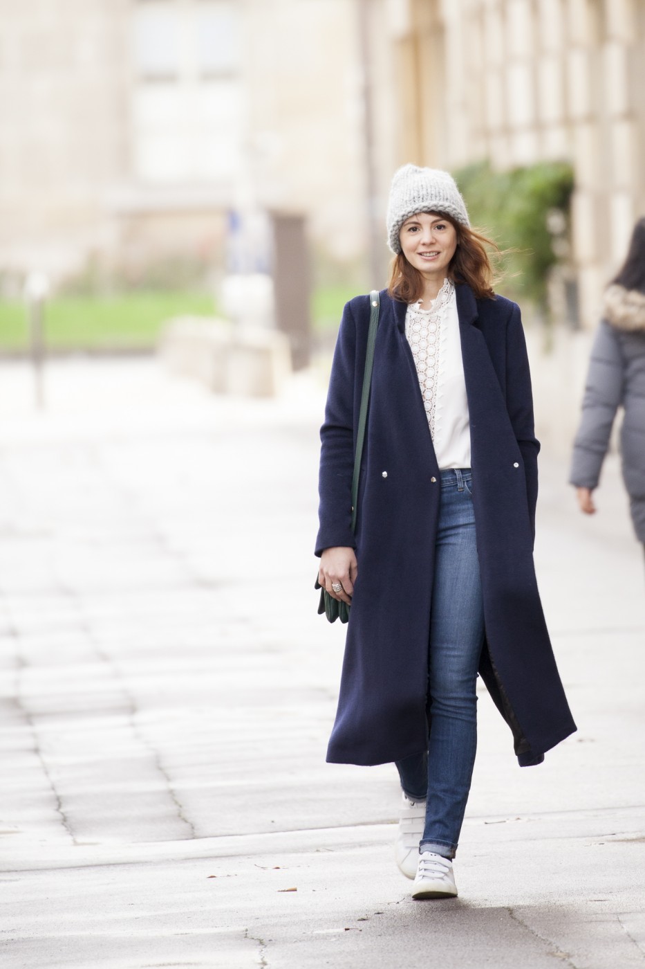 Me voilà donc avec une petite chemise toute légère, assortie à un manteau bien chaud (je suis joueuse jusqu’à un certain point). Et un bonnet en grosse maille parce que c’est bien connu, c’est par les extrémités qu’on attrape froid ! Ah, et oui, je porte ENFIN un autre jean : j’ai renouvelé mon stock de jeans de bonnasse (pas que je me trouve bonnasse, hein, vous vous souvenez, le jean de bonnasse c’est celui dans lequel on se SENT bonnasse. La nuance est de taille) avec ce modèle de chez J Brand. Ils sont hors de prix, mais ils tiennent vraiment bien. Je m’en offre un à deux max chaque année.. et je ne le regrette pas !