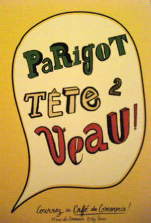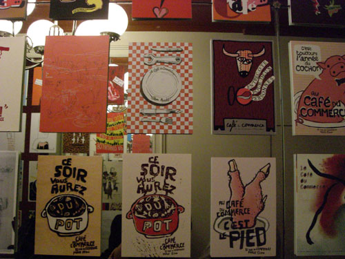 Il faut dire que le contexte était propice ? l’hilarité : un soir d’avril, nous sortons du Café du Commerce (brasserie authentiquement parisienne que je vous recommande chaleureusement, d’autant plus qu’outre la qualité des plats, les serveurs sont absolument parfaits) où nous venons de fêter l’anniversaire de deux de nos zamis. Oui, nous avons un peu bu, ceci explique peut être cela. Toujours est-il qu’en sortant, nous sommes attirés par des affiches qui sont disposées de part et d’autre du couloir que nous traversons. Les couleurs sont vives, les artistes inspirés pour ce qui semble être un concours d’affiche mettant d’une manière ou d’une autre le Café du Commerce en scène. Ce qui donnait ? peu près ceci :