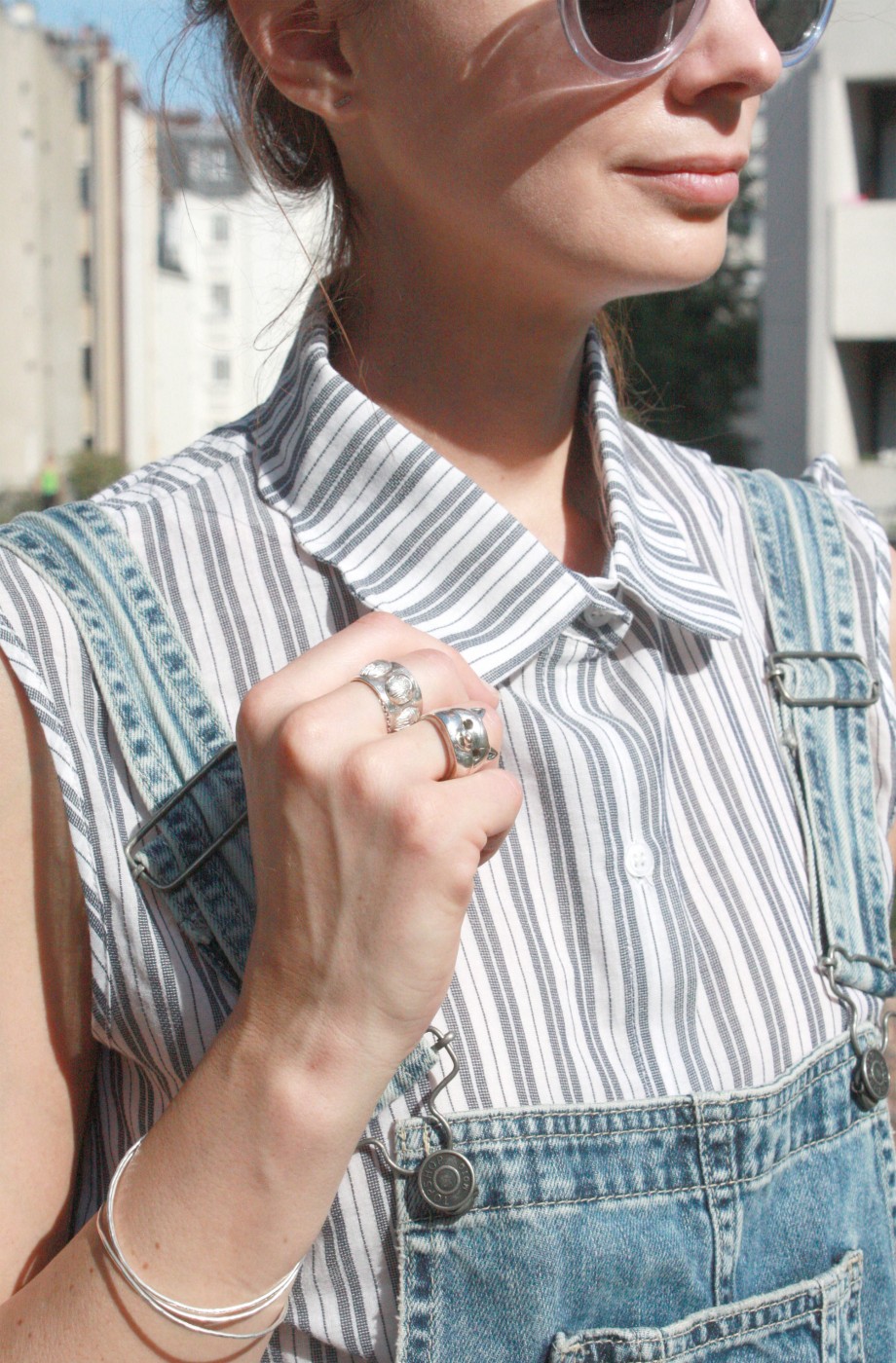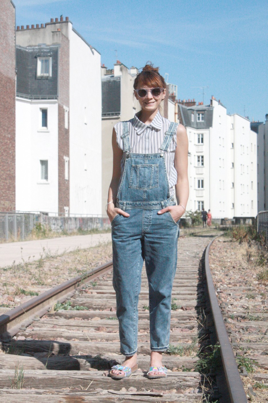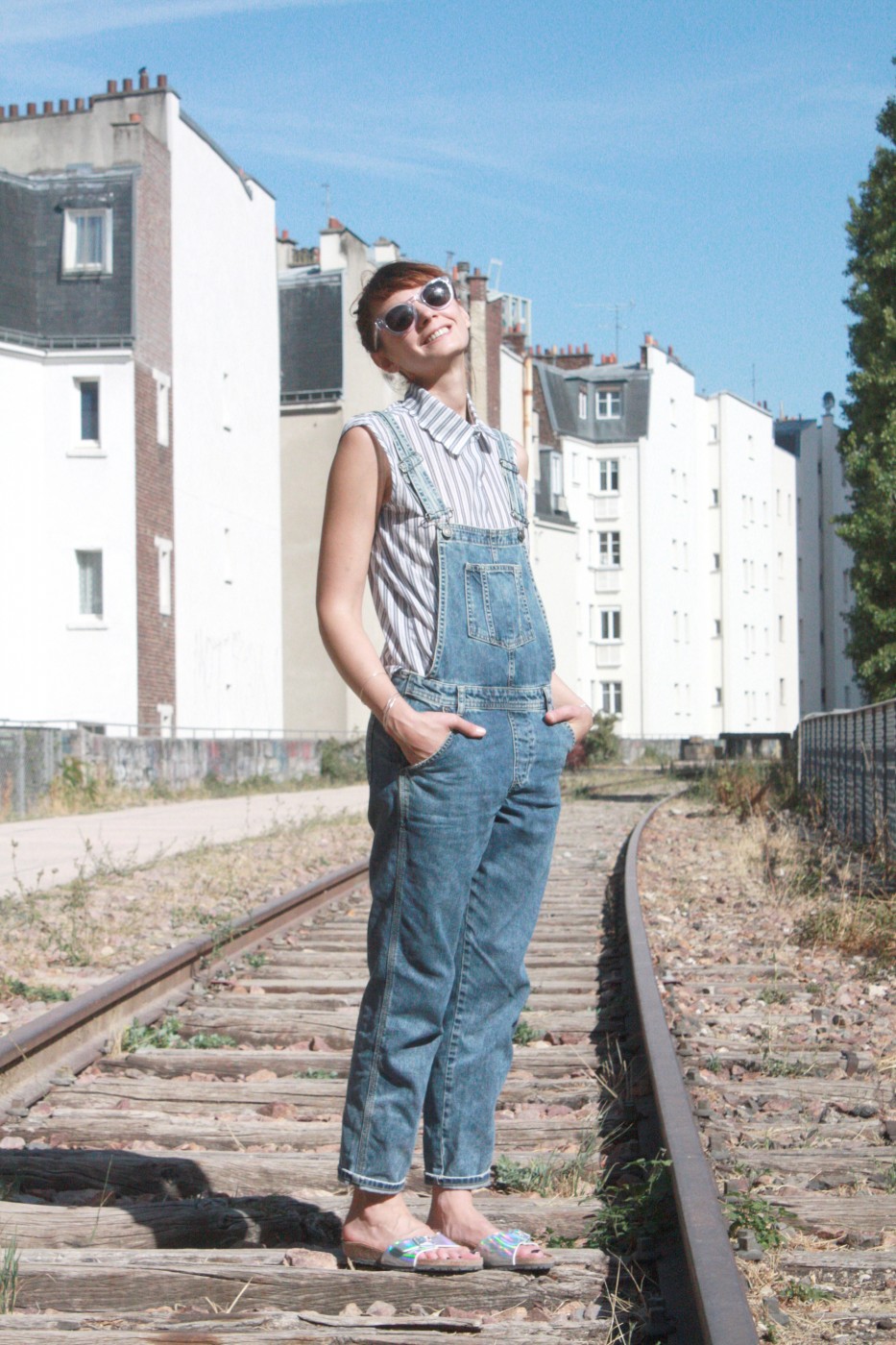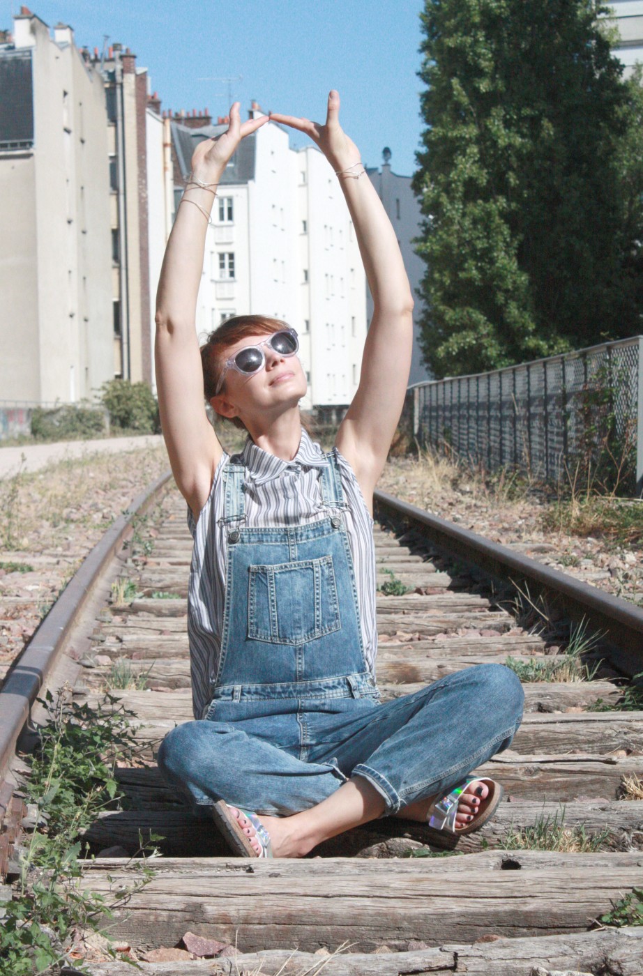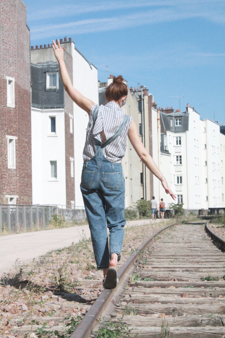Ensuite, j’ai eu la brillante idée de vouloir faire un détour par la Fête des Tuileries. Un dimanche. En plein été. C’est drôle comme parfois, nos envies nous font taire la réalité…! Après 2 secondes trente à espérer pouvoir nous frayer un chemin parmi la foule, la moiteur et #lesgens, on a rebroussé chemin fissa, en quête d’un plan B plus praticable. C’est donc la portion de la petite ceinture du 15ème réouverte il y a deux ans et quelques qui l’a emporté. Et haut la main, avec ça. Ah ça pour sûr, le 15ème n’amasse pas foule… et c’est tant mieux ! Là, au milieu des rails qui transportaient naguère les animaux vers l’abattoir du parc George Brassens (pas glop), on a pu jouer à sauter entre les traverses, faire un petit géocaching (vous connaissez ? Je suis fan !), paresser à l’ombre de quelques arbres. Et shooter ce look, donc.