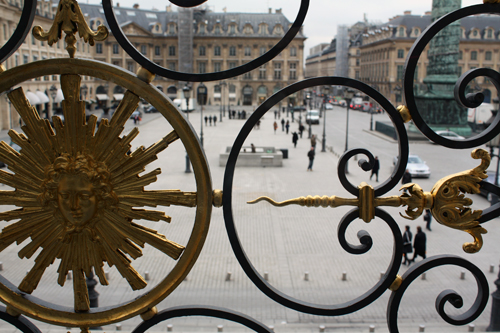 Non, je parle de ce balcon duquel on aperçoit la so famous place Vendôme. J’aime cette vue banale et à la fois un peu extraordinaire puisque prise du premier étage d’une des maisons qui habite la place. J’aime ce soleil éclatant qui réchauffe la grisaille ambiante à grands coups de rayons dorés. J’aime l’immuabilité du sieur, qui tourne ostensiblement le dos à la place et à la vie que l’on devine à quelques pas. J’aime le fait qu’il semble nous protéger de cet extérieur gris, froid, plat. J’aime la vie qui s’écoule mollement, au loin. Un spectacle auquel je pourrais assister des heures et des heures…