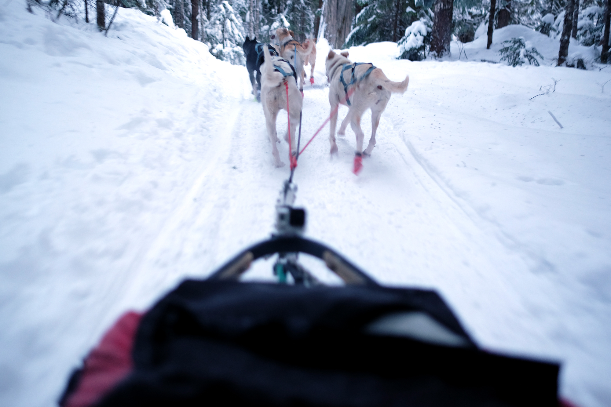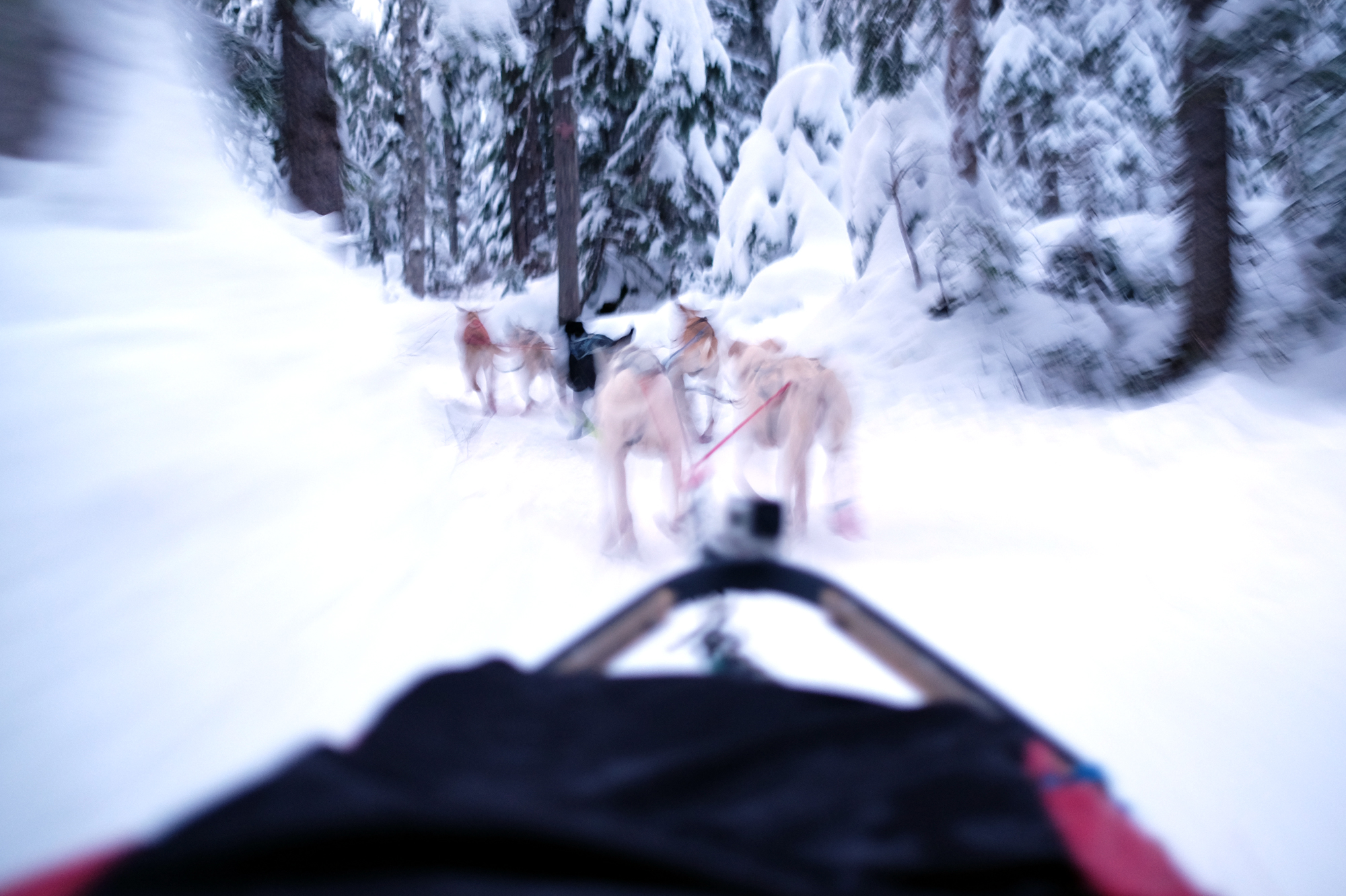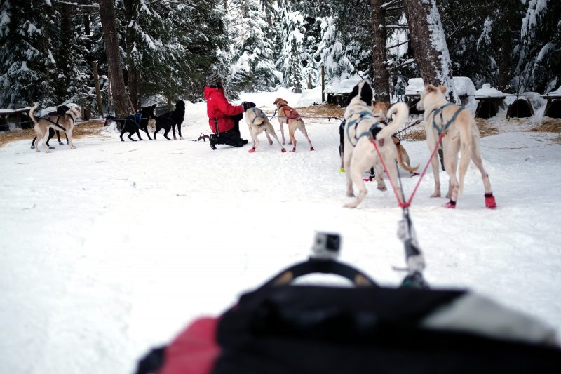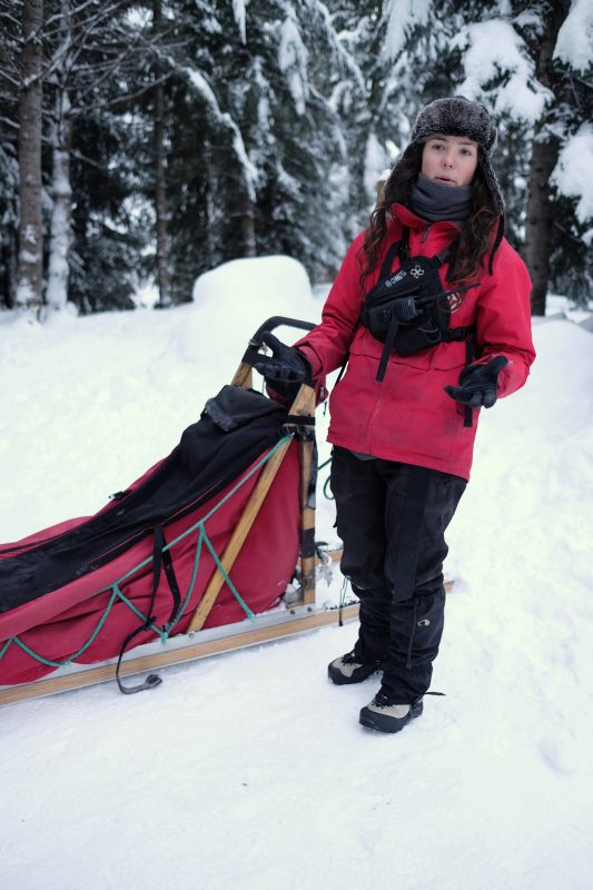 Je ne sais pas trop comment traduite l’excitation teintée d’une vague appréhension face à ce troupeau de chiens qui hurle à la mort. Ce que je sais, c’est qu’une fois que je me suis pelotonnée dans le traineau sous le kilo de couvertures, j’étais comme une petite fille qui découvre ses cadeaux le matin de noël : le traineau qui glisse, tout près du sol, la puissance des chiens complètement incroyable, la dextérité de la guide qui mène le troupeau. Surtout, la forêt qui nous entoure est enchanteresse et s’offre à nous comme jamais… J’aurais pu en pleurer de bonheur.