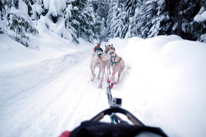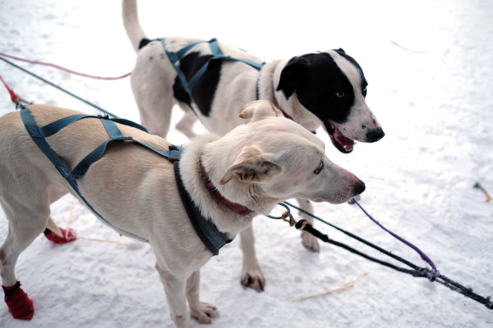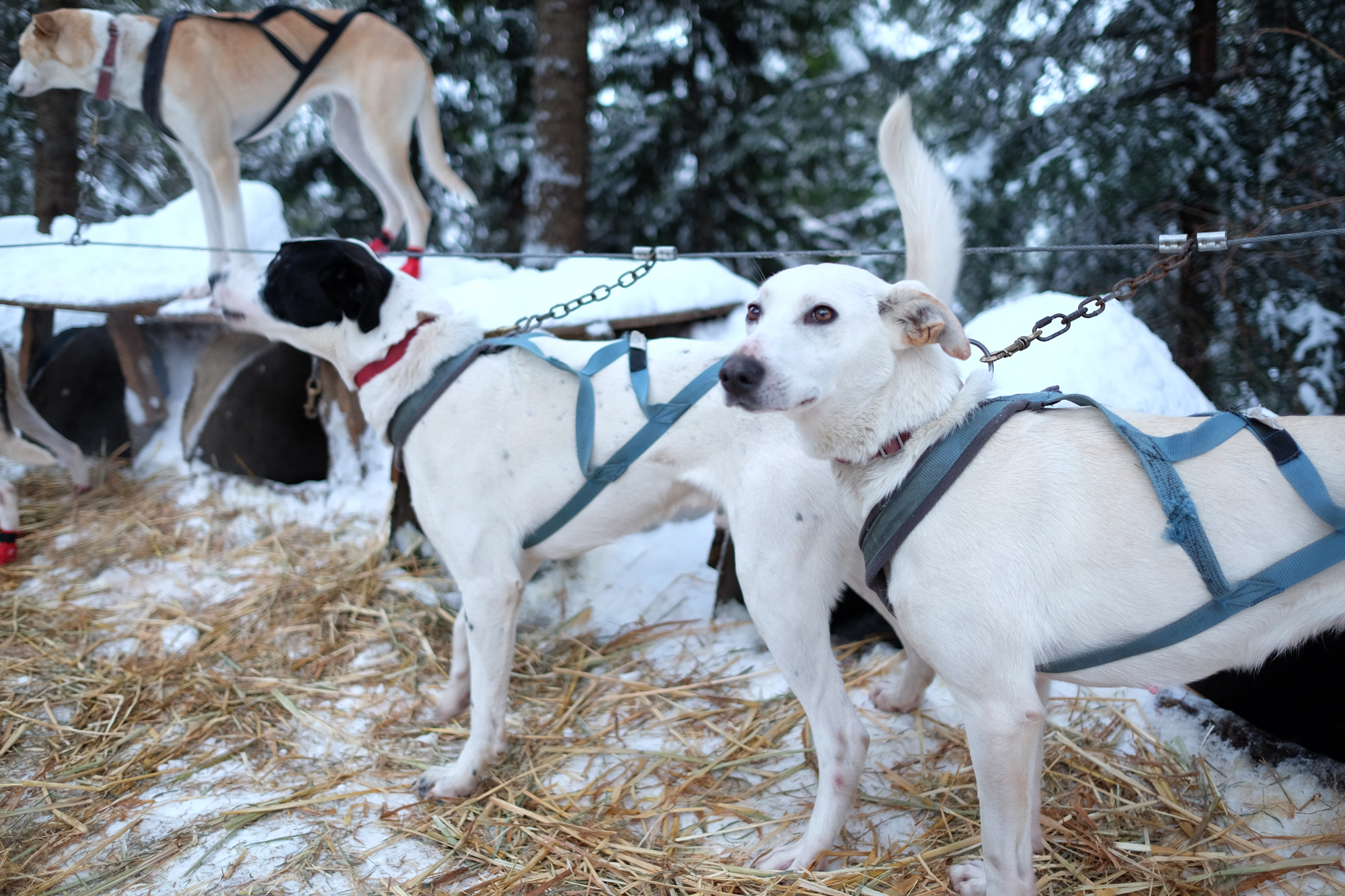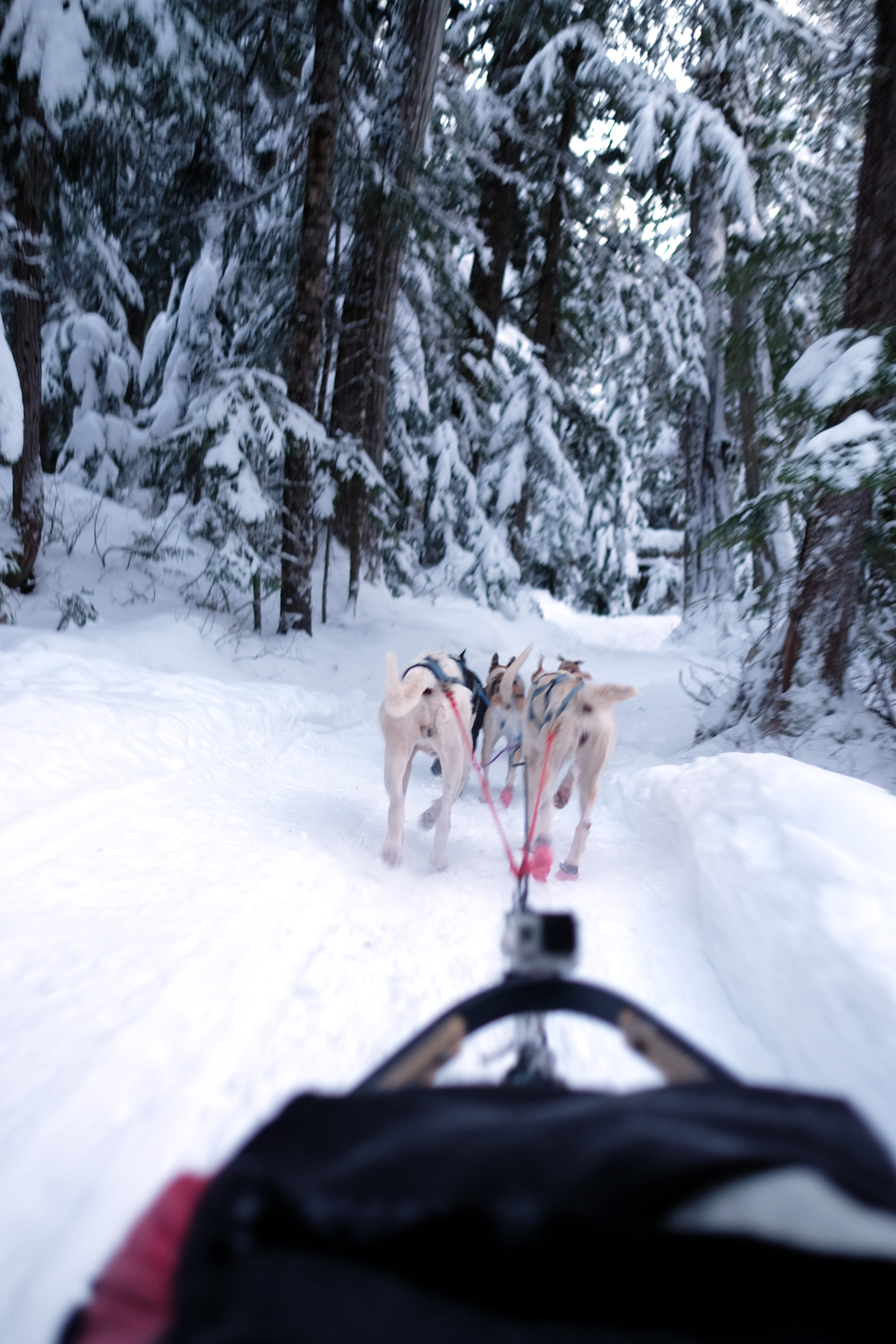 Je ne sais pas trop comment traduite l’excitation teintée d’une vague appréhension face à ce troupeau de chiens qui hurle à la mort. Ce que je sais, c’est qu’une fois que je me suis pelotonnée dans le traineau sous le kilo de couvertures, j’étais comme une petite fille qui découvre ses cadeaux le matin de noël : le traineau qui glisse, tout près du sol, la puissance des chiens complètement incroyable, la dextérité de la guide qui mène le troupeau. Surtout, la forêt qui nous entoure est enchanteresse et s’offre à nous comme jamais… J’aurais pu en pleurer de bonheur.