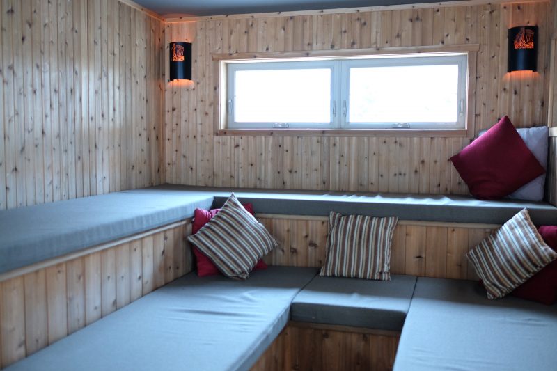 Je vous explique le délire : à l’extérieur, il fait un petit -15°C. Vous enfilez un peignoir, vous sortez, pieds-nus (!) (le sol n’est qu’à 0°C, ça va) (..!), vous foncez jusqu’au sauna pendant une quinzaine de minutes comater sous les +85°C de rigueur. Une fois que votre peau ressemble à celle d’un homard avant cuisson, vous sortez vous immerger dans un bain à 13°C. Avant de rejoindre une salle de méditation.
