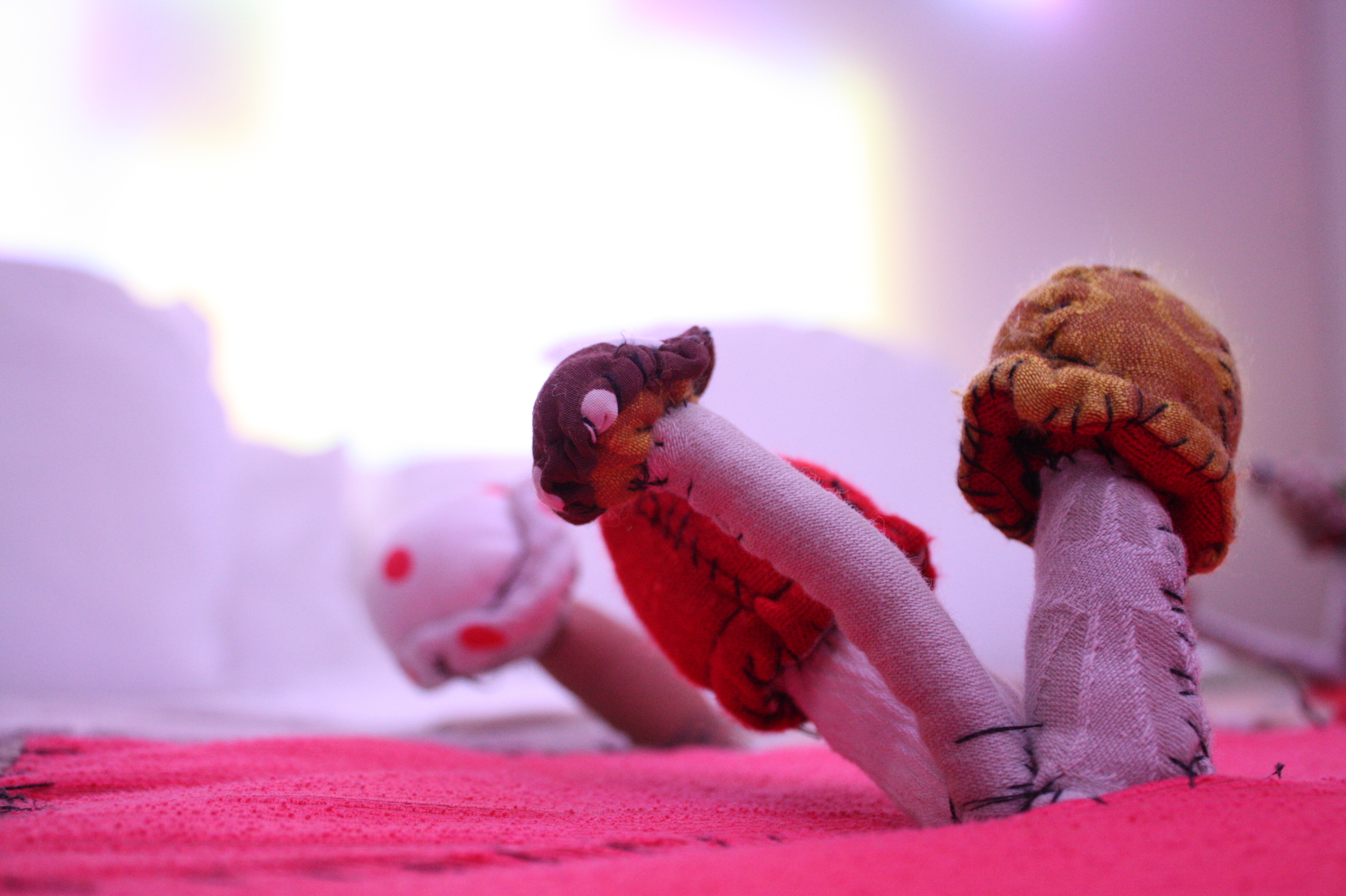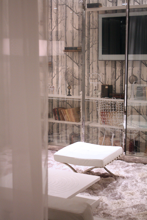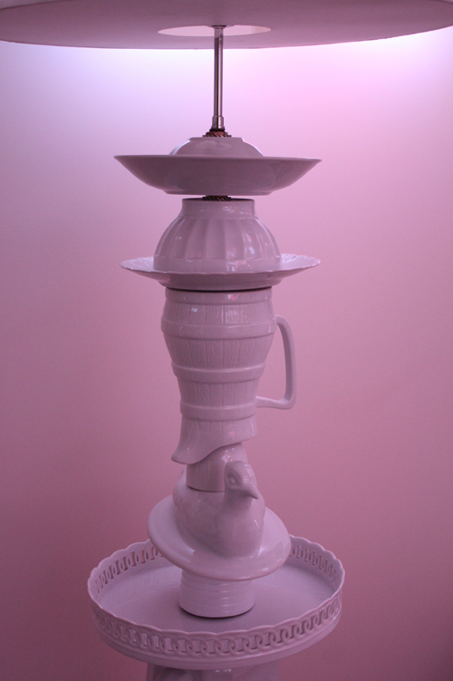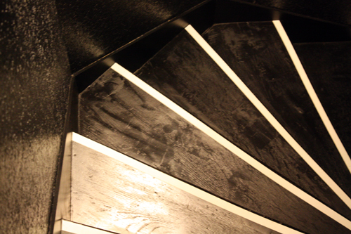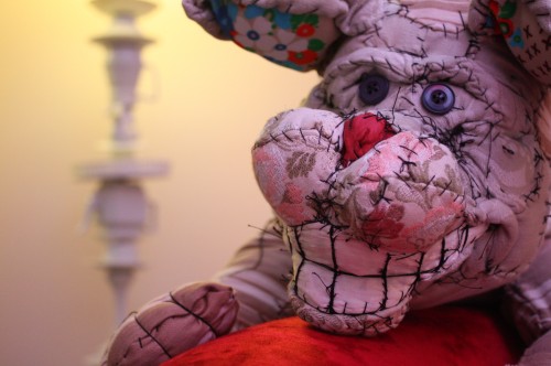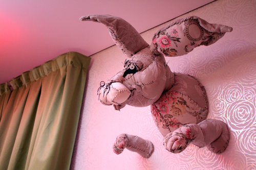 Ici, les lumières jouent avec les matières, douces, ludiques et amusantes. On se croirait presque dans une chambre d’enfant à l’usage des adultes. Un gros lapin sort du mur sous l’œil goguenard du chat, mollement étalé sur la canapé. La vaisselle se mue en lampe, et le mur mitoyen entre la chambre et la salle-de-bain présente à qui le trouve un petit trou depuis lequel on peut observer la salle-de-bain…