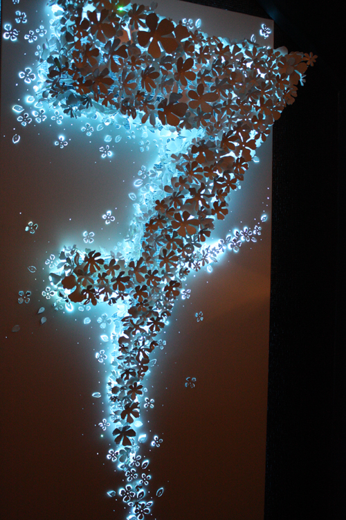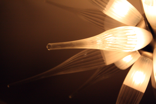 Ici, une nuée de boules de verre flottent comme autant de bulles de savon. Les miroirs dupliquent à l’infini les jeux de lumières et de matières.