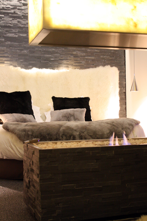 Les tapis sont tellement moelleux que je m’y loverais bien pour y passer la nuit. Évidemment, c’était avant de tester la douceur et le moelleux incomparable du lit, lequel est rond !, et fait face à une cheminée incroyable qui trône au milieu de la chambre. Si le temps avait été de la partie, j’aurais même pu profiter des joies du jacuzzi de la terrasse privative de la chambre… groumpf (trop dure la vie !).