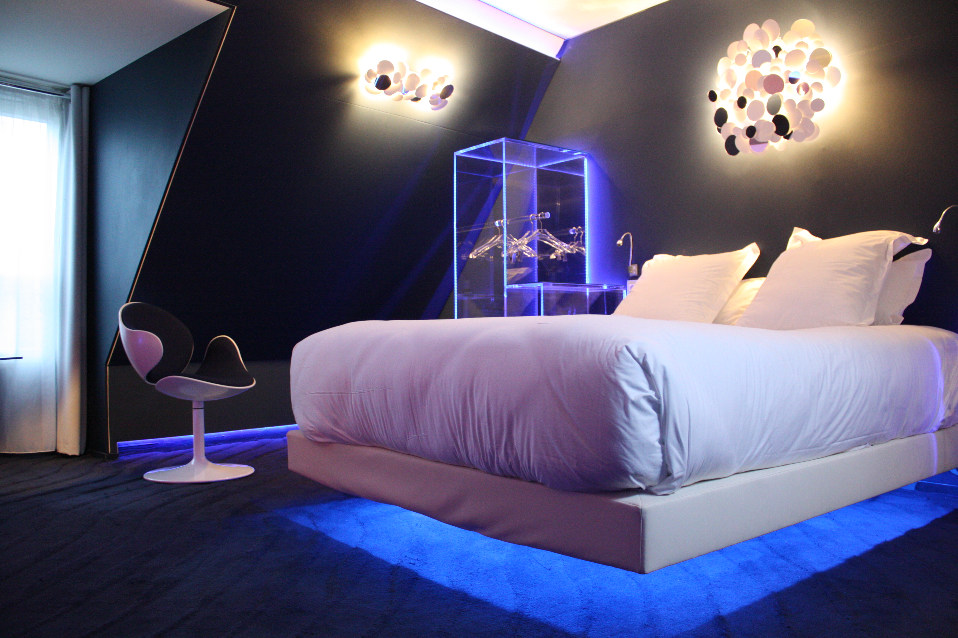 L’hôtel compte 28 chambres où l’on dort en apesanteur (les lits sont en lévitation !) et 7 suites. 35 écrins lovés au creux d’un nid de lumières totalement modulables et que je vais pouvoir visiter. Je ne sais pas si mes photos vont retranscrire la féerie de ces lieux, mais je tente malgré tout de vous embarquer dans ce voyage !