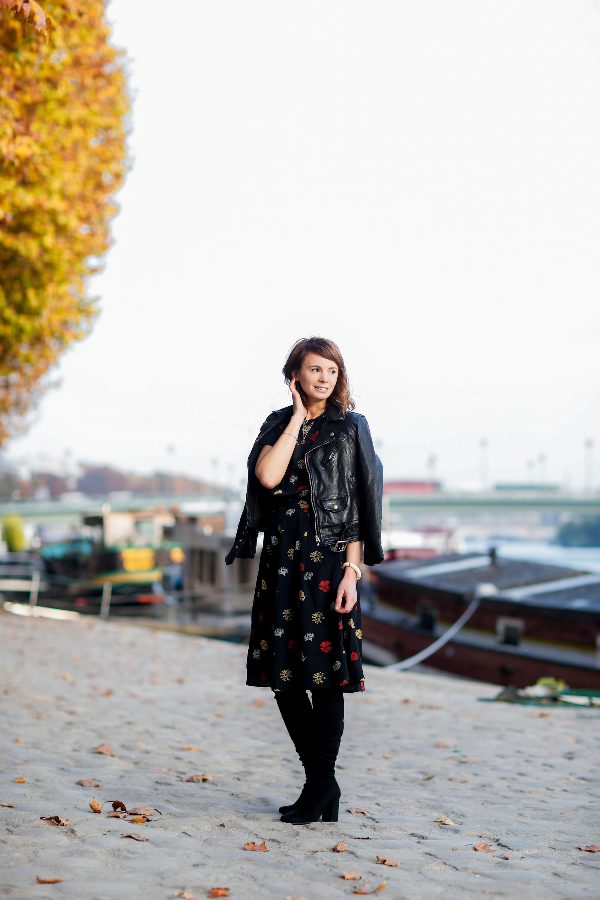 j’aime beaucoup ce genre de tenue. tout est parfait, de la robe sage au cuir qui dynamise le tout en passant par les cuissardes qui sont tout à fait chic portées ainsi !