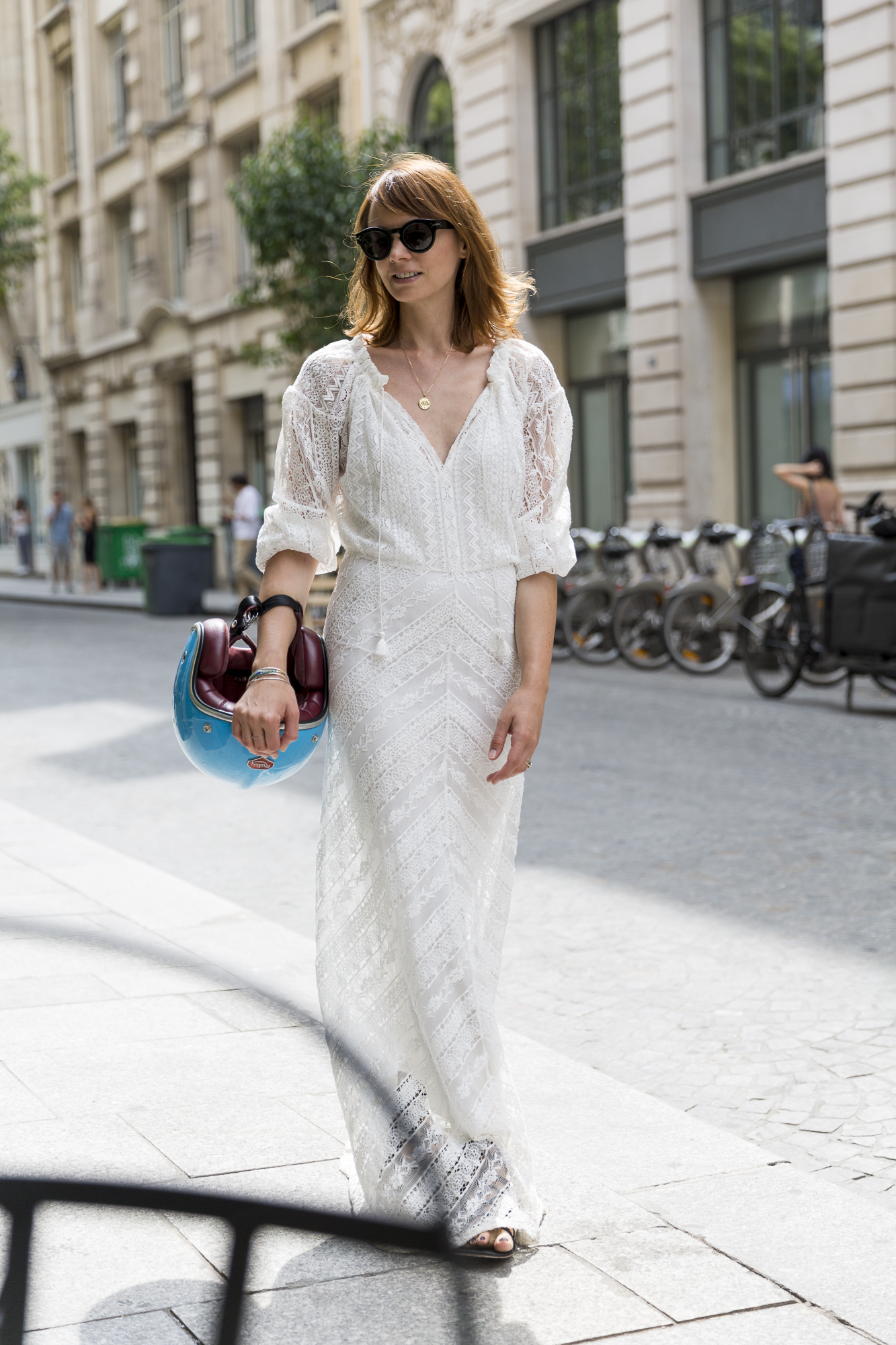 Autre robe blanche, autre robe longue… et pourtant, rien à voir : je suis en amour absolu pour celle-ci, dégottée à la toute fin des soldes dans une enseigne où je n’avais plus mis les pieds depuis bien longtemps. Les manches longues permettent d’affronter les frimas jamais bien loin du climat parisien, la dentelle de croire encore un peu à l’été !