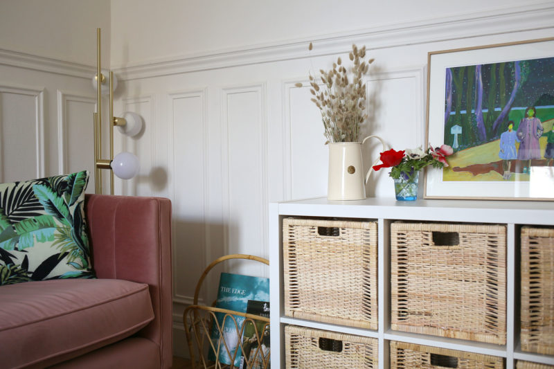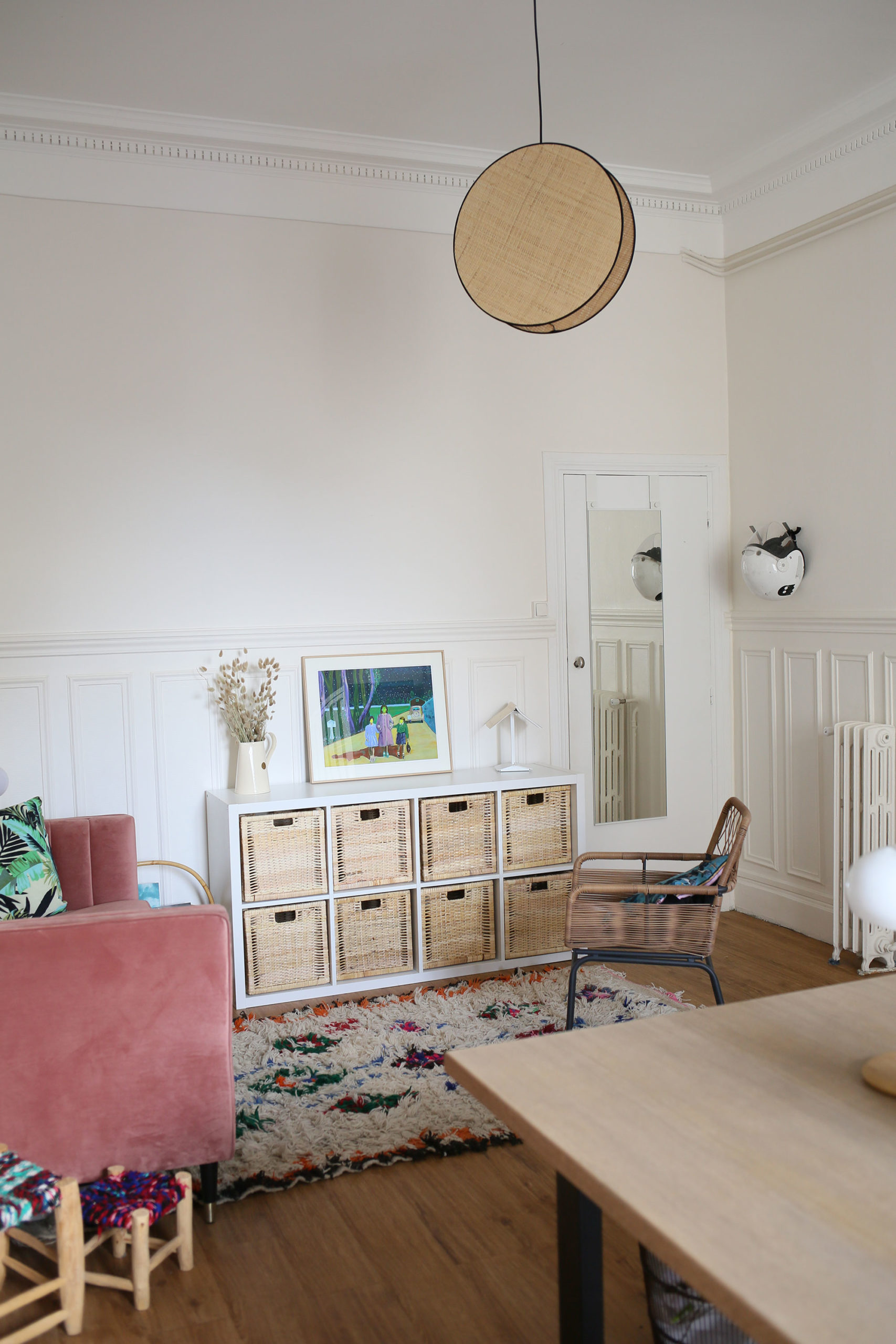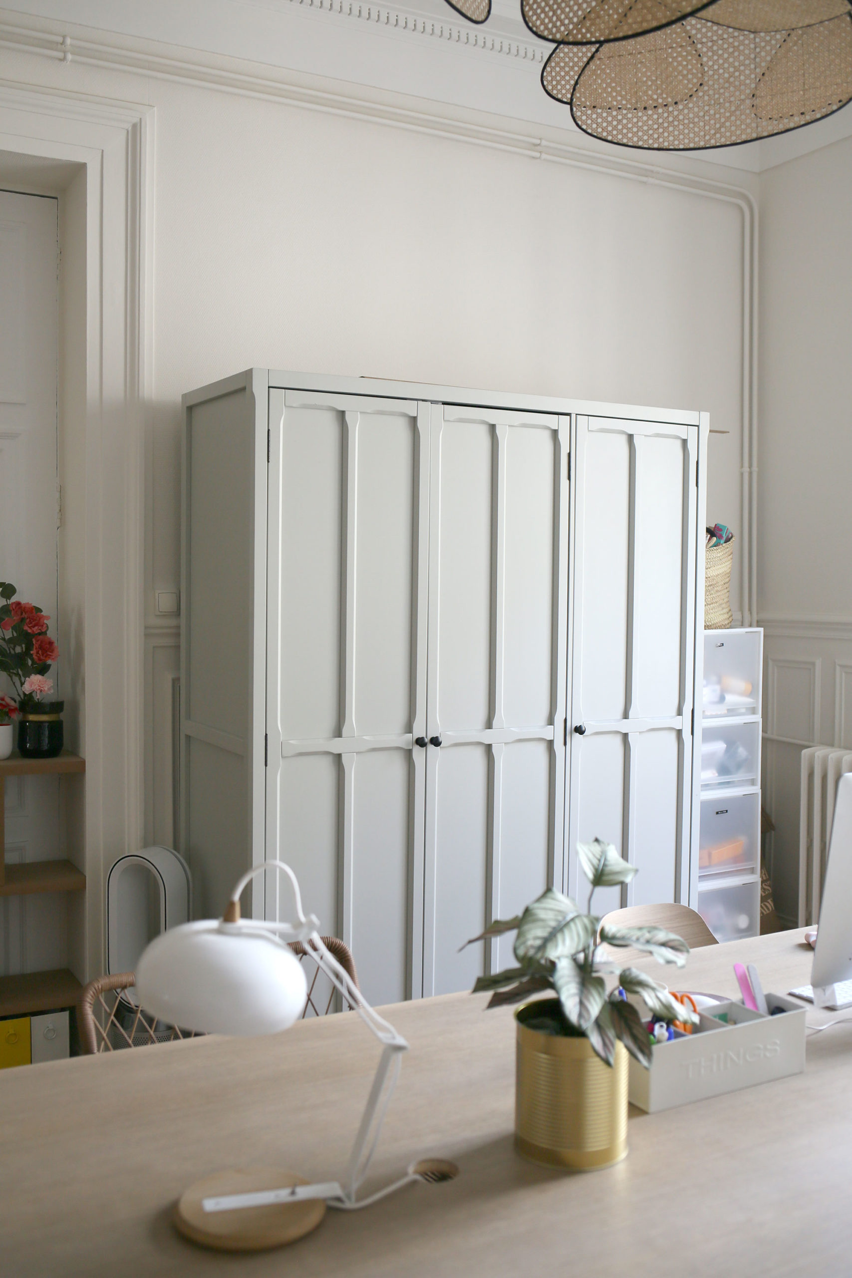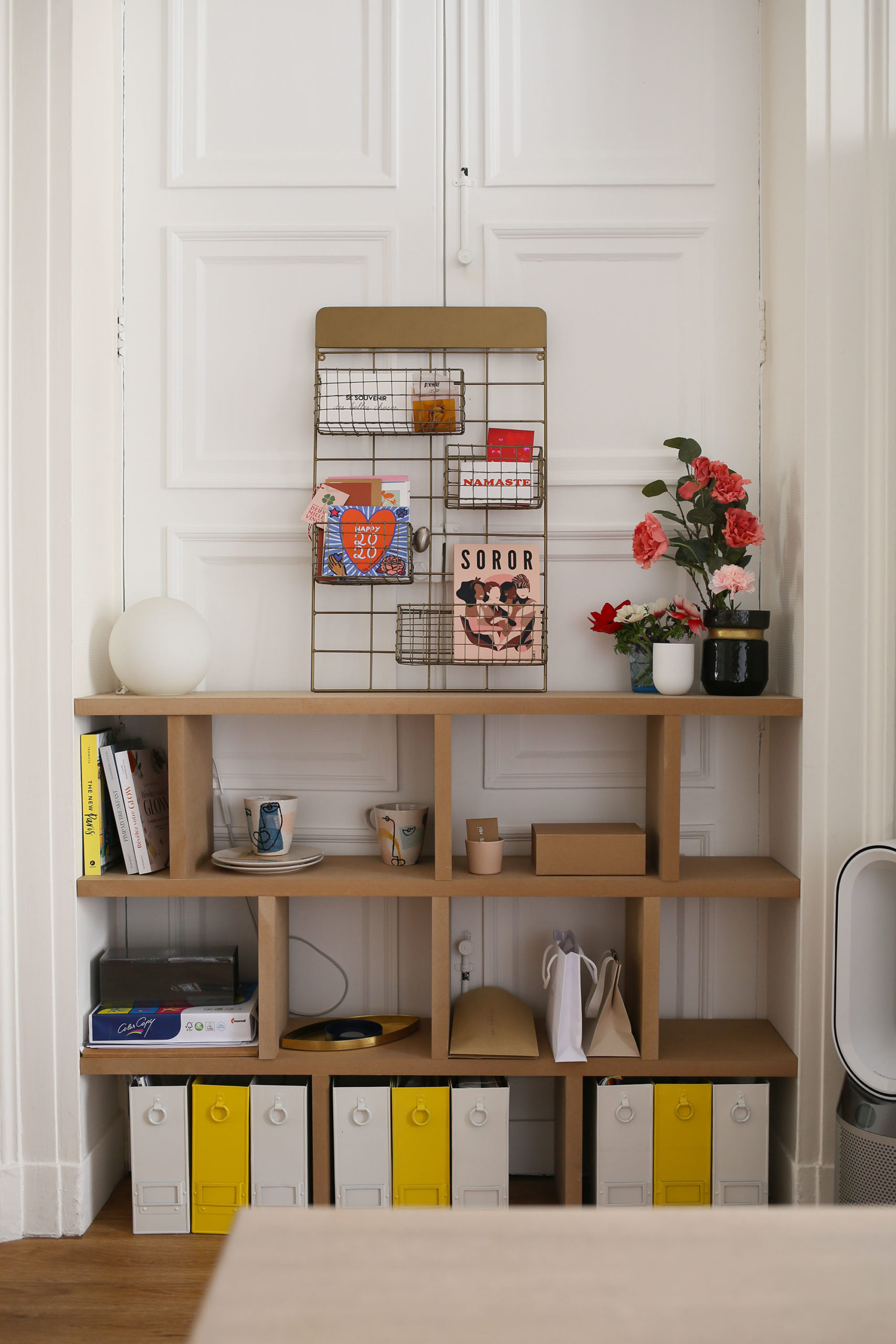 Pour le reste, j’ai réutilisé le meuble Ikea que j’avais acheté il y a quelques années, j’ai troqué les casiers en plastique blanc pour des paniers, qui offrent plein de place pour les colocs de de bureau.