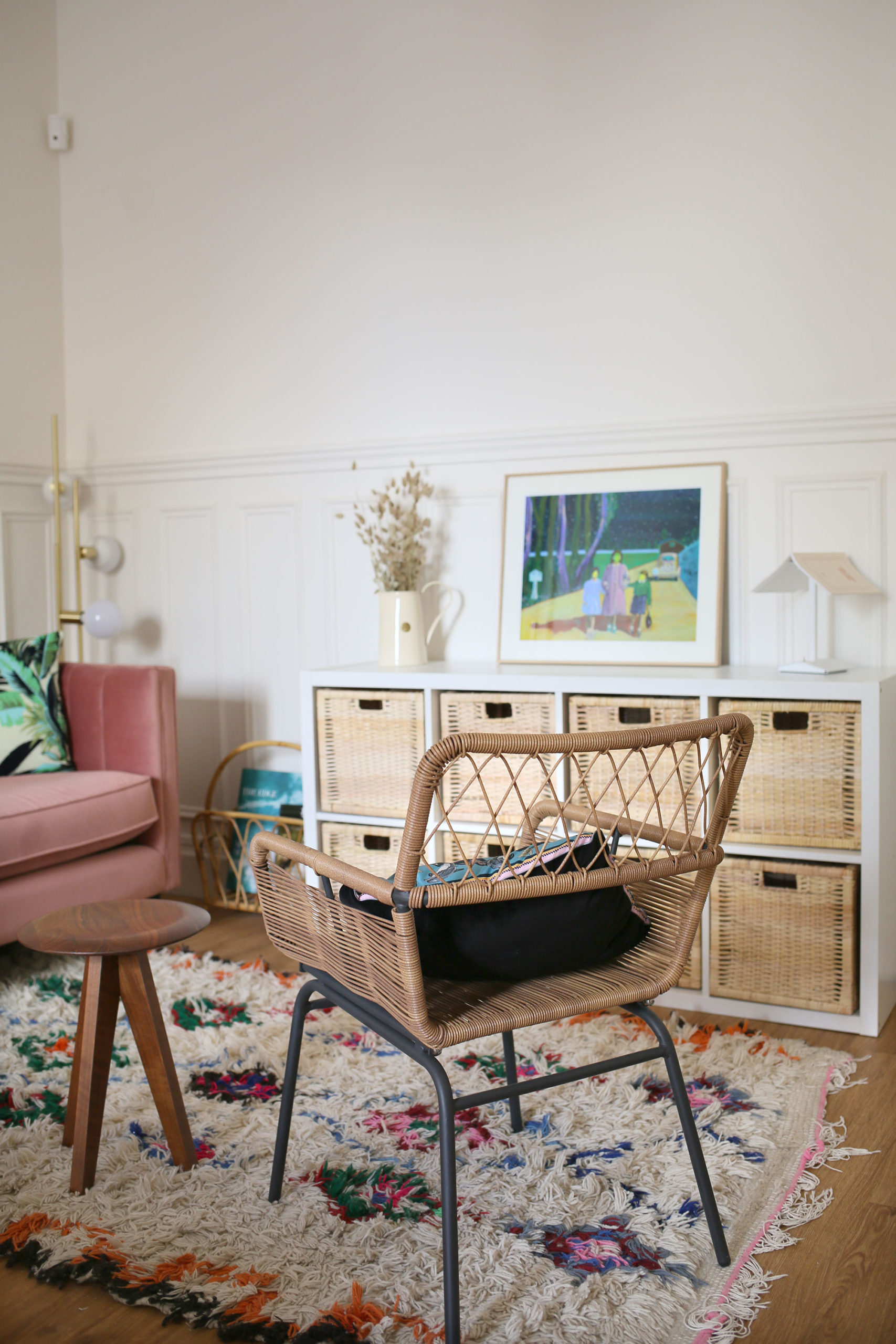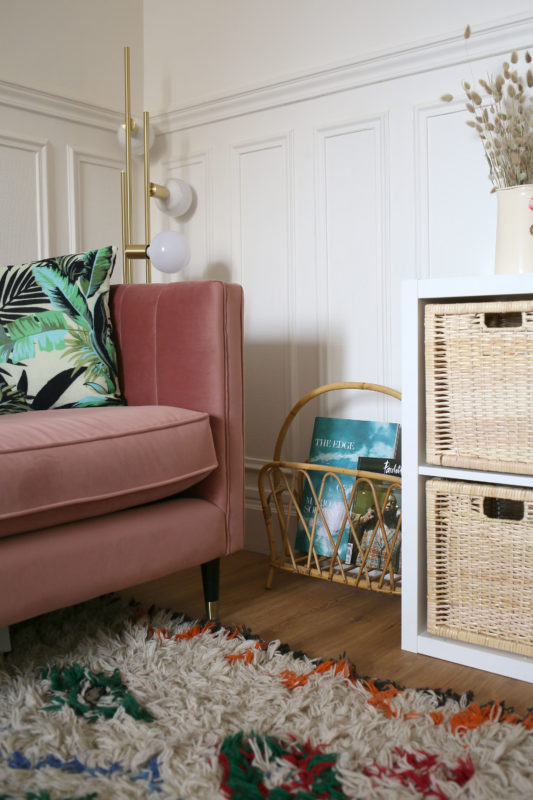 Je radote, mais pour créer une ambiance un peu « cosy » et renforcer le côté salon de la pièce, j’ai réutilisé le tapis que je m’étais offert en avril 2017 pour Chez Deedee. Hors de prix (on peut clairement trouver des tapis berbères moins chers), mais il n’a jamais bougé pendant 3 ans et les très nombreux événements qu’il a vu passer !