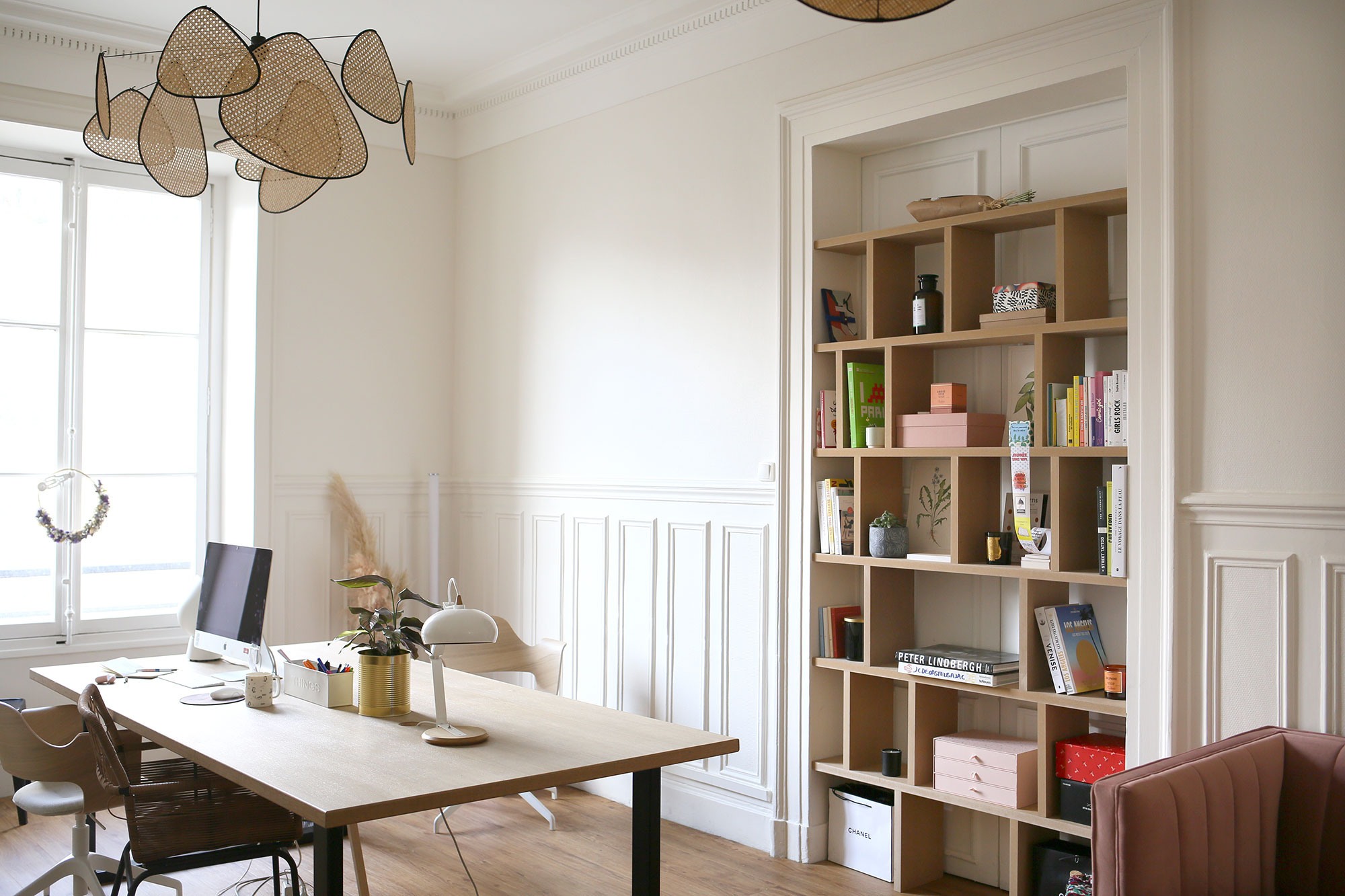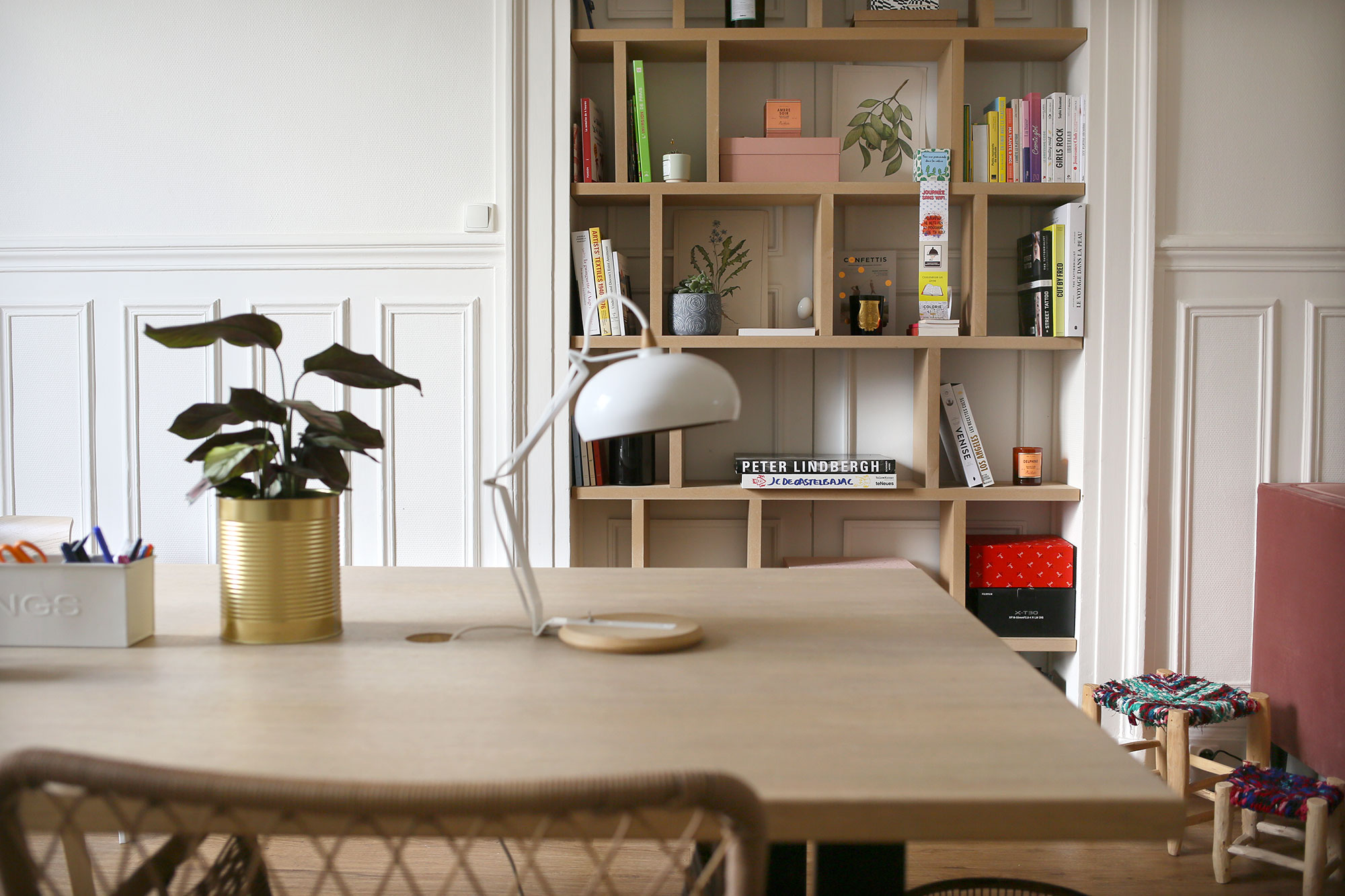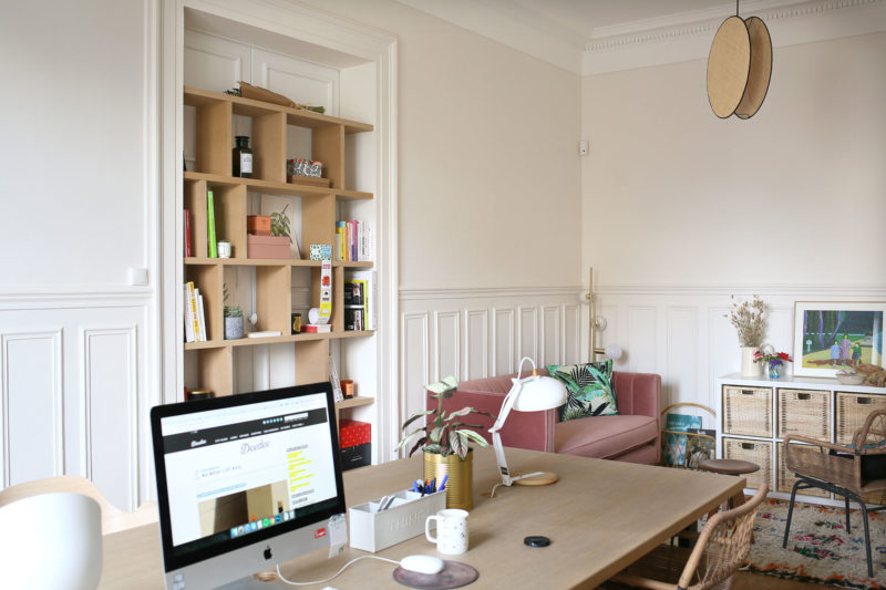 Au bout de ce mois et demi et quelques à pimper, réutiliser et mettre les mains dans le cambouis, on y est à peu près. J’ai profité du début pour faire ces photos : soyons clairs, le bureau ne sera jamais aussi bien rangé que sur ces photos… Ok ok, je vous livrerai une preuve dans quelques semaines. D’ici là, vous me suivez pour la visite ? J’ai essayé de rassembler la visite en thématiques pour que vous puissiez éventuellement choper quelques idées au passage pour composer un bureau qui ne ressemble pas trop à un bureau : je suis freelance, j’ai cette chance de ne pas avoir à composer forcément avec un mobilier imposé. Ça tombe bien, je n’aime pas les bureaux standards, avec leur mobilier normé à tendance sinistre… !