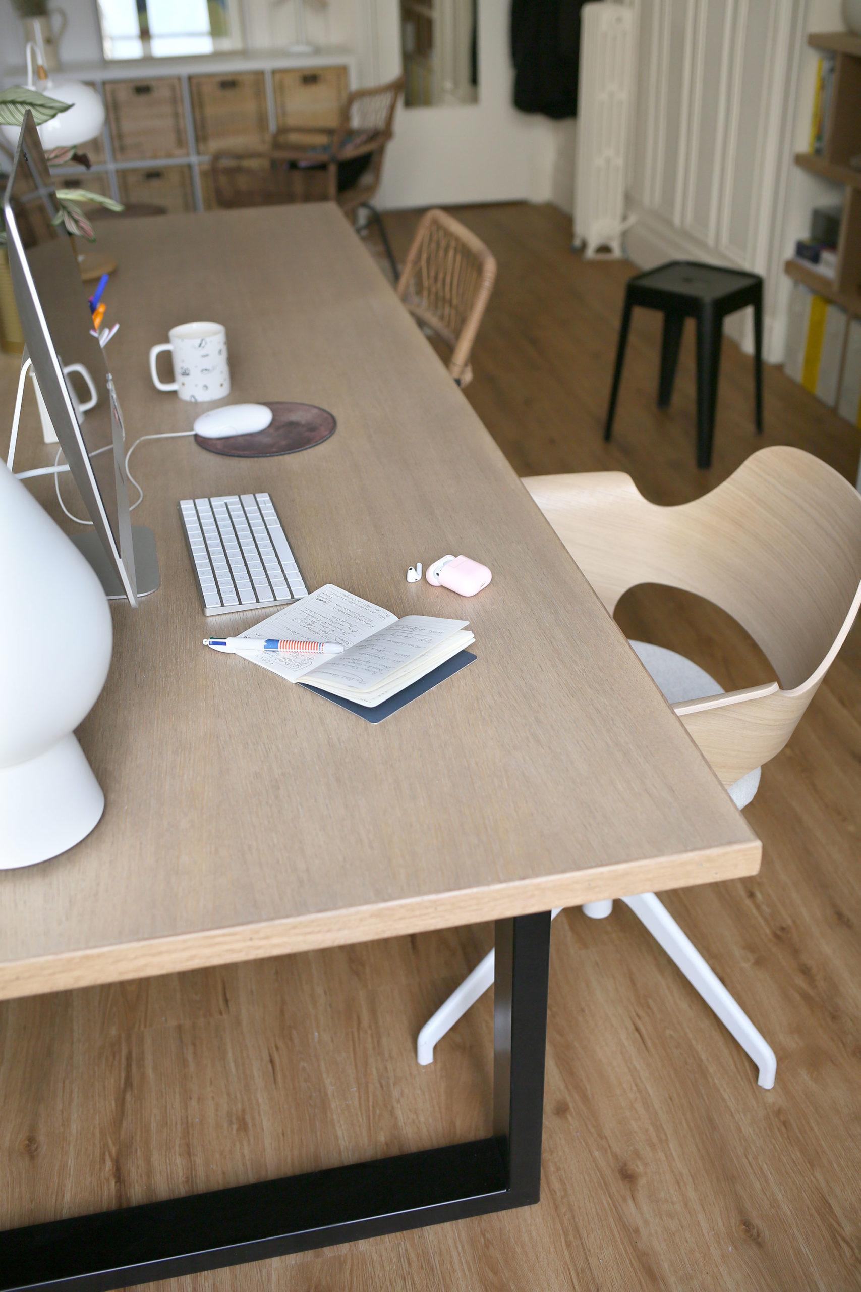 J’avais d’abord commandé une grande table de salle à manger. 3 semaines après, ma commande était annulée… J’ai été contrariée, avant de réaliser que c’était sûrement mieux comme ça : ma table, j’allais la faire toute seule comme une grande, ça me coûterait largement moins cher et j’allais en plus pouvoir la pimper, notamment avec des trous pour faire passer les câbles (oui bon ok, avec l’aide de monsieur dont c’est le métier, de fabriquer des meubles). J’ai prévu un tuto récap sur le sujet, mais en gros, j’ai choisi un chêne laté de 1,8mm d’épaisseur, un vernis neutre (après m’être plantée à cause d’un nuancier vraiment très approximatif si vous avez suivi sur IG !) et des pieds métalliques bien épais et stables.