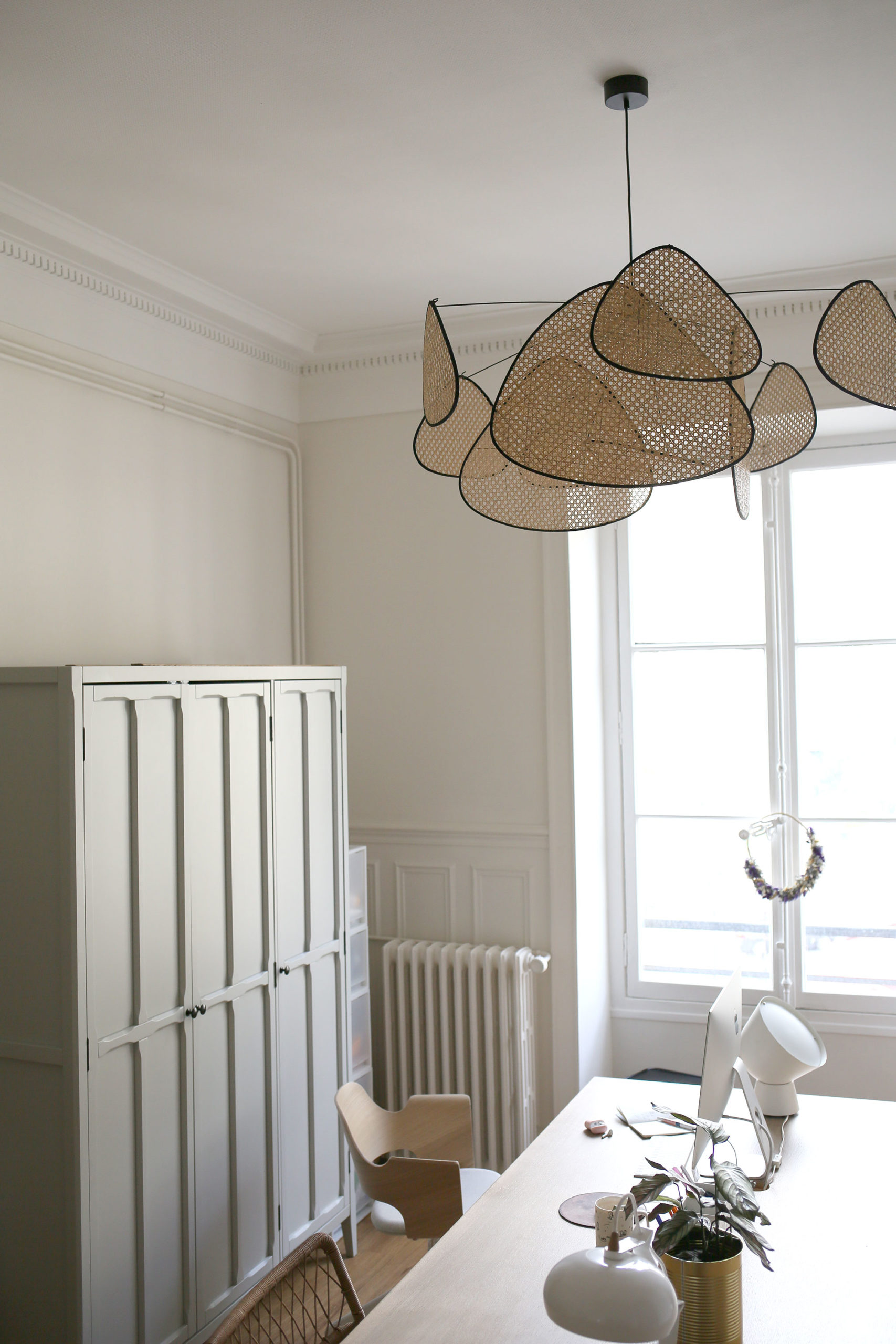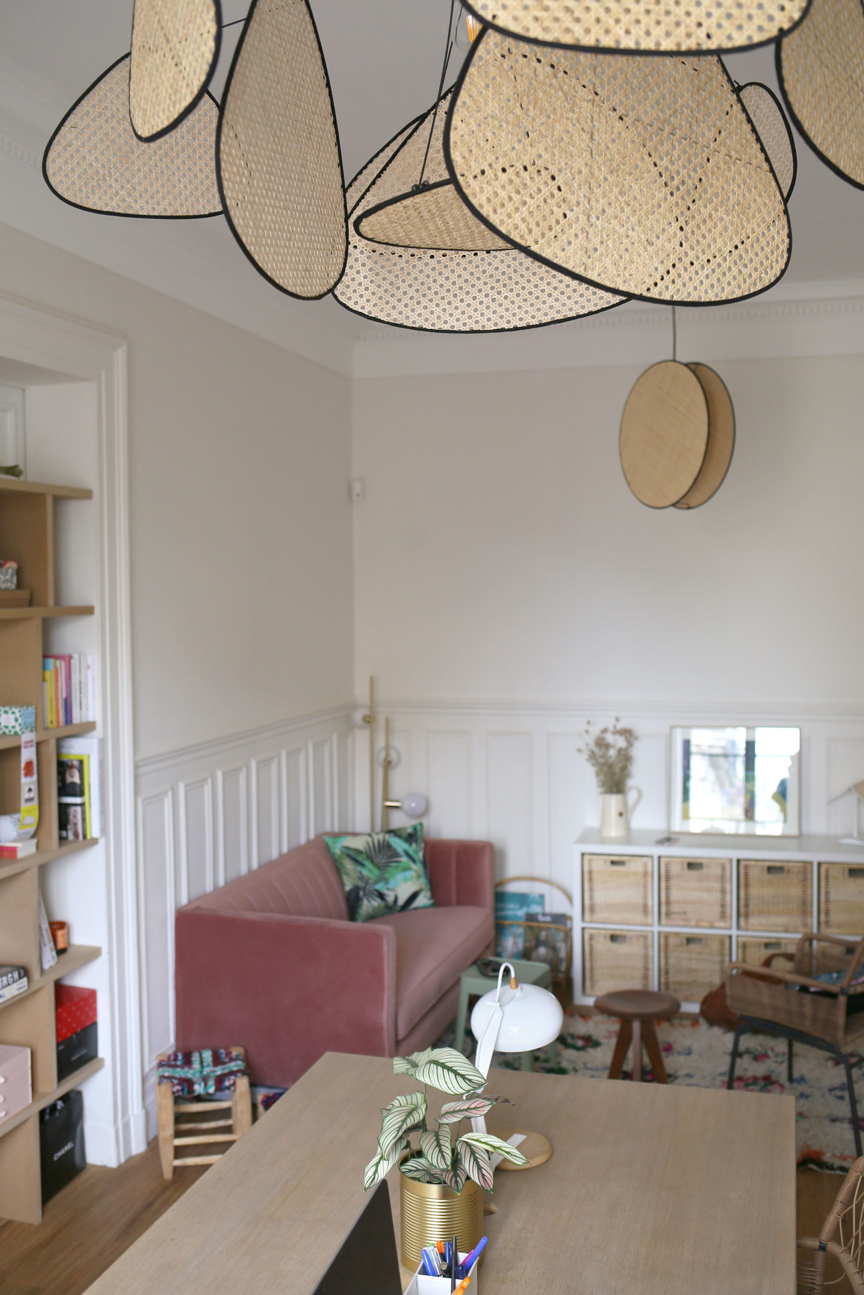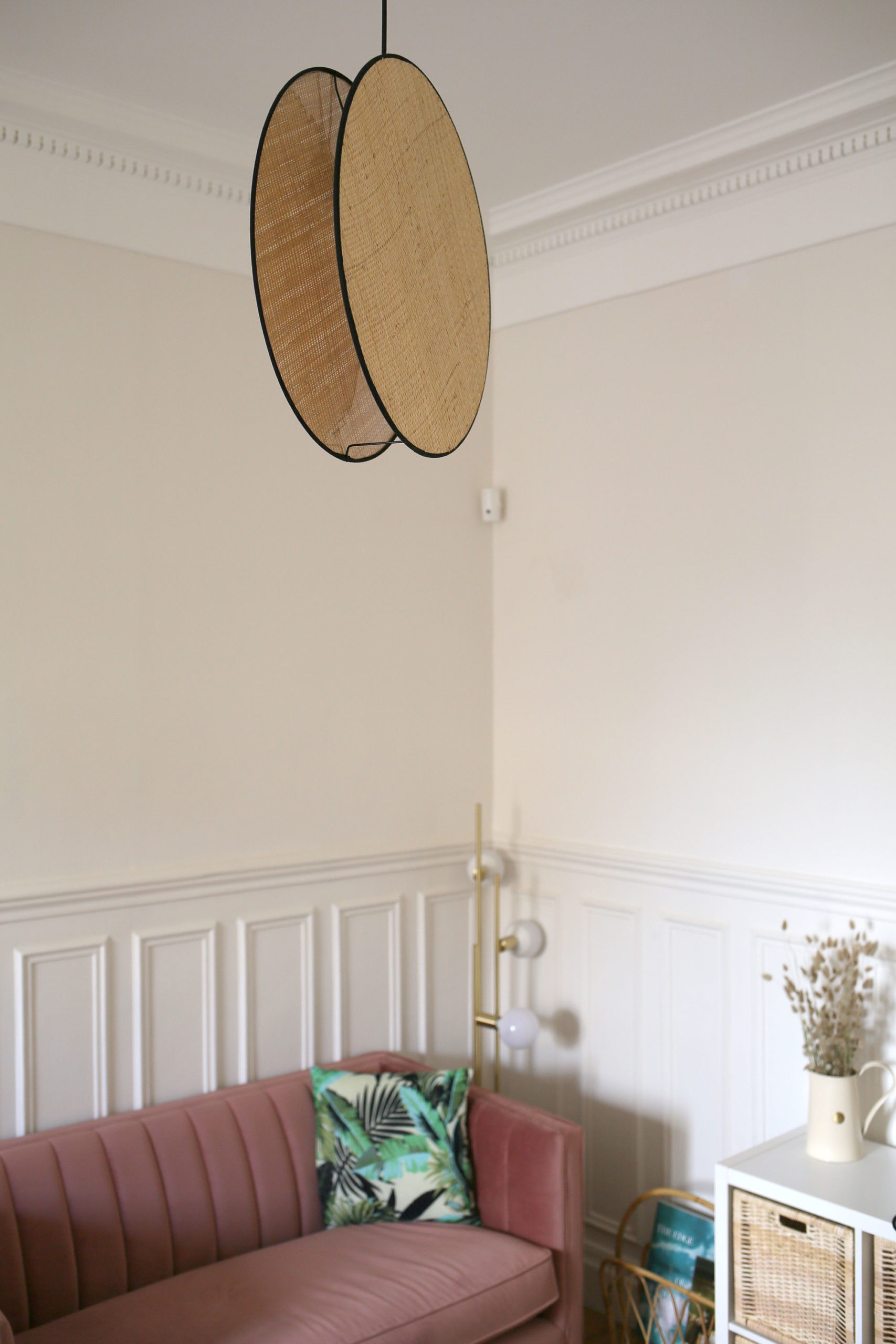 Pour le second plafonnier, je voulais une lampe qui complèterait bien la Screen. Et c’est chez Les Décos d’Axelle que je l’ai trouvée : ronde, en rotin bordé de noir, elle apporte une lumière parfaite et un bon équilibre entre les deux, vous ne trouvez pas ? J’aime beaucoup la sélection que fait Axelle en matière de déco : on y trouve des luminaires, donc, mais aussi des vases, coussins, plaids, bougeoirs et autres objets utiles ou plus décoratifs. Allez voir son compte IG !
