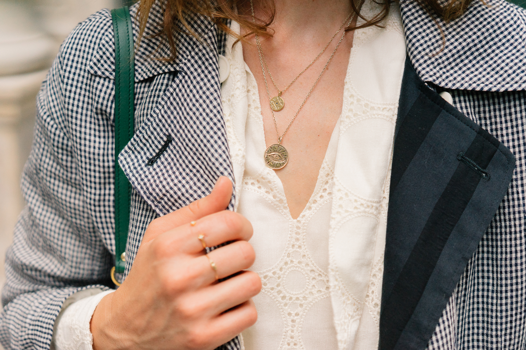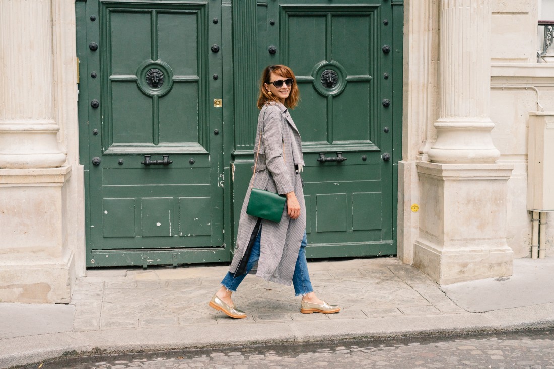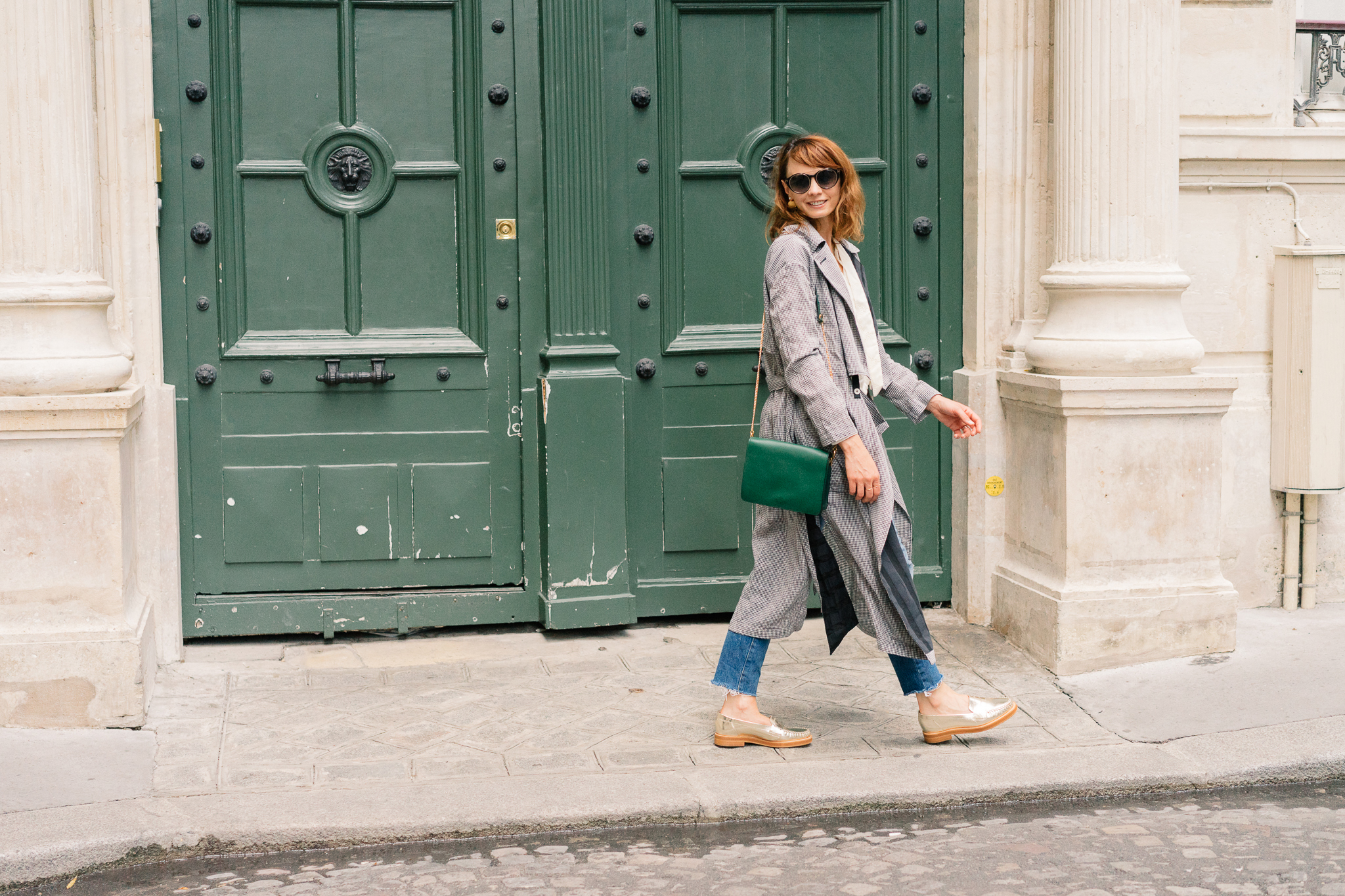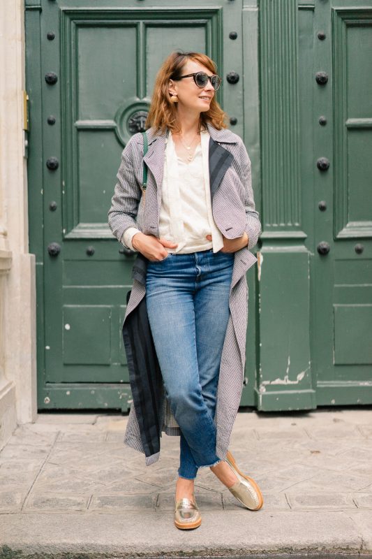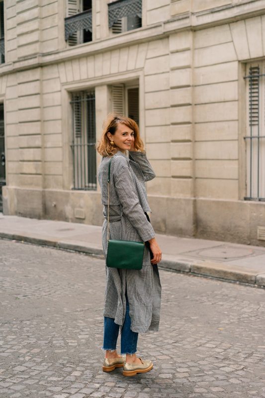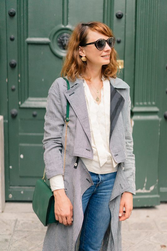 Bon, alors oui, non, on ne va pas verser dans la vacuité affolante du point météo… Mais quand même, c’est un peu les boules ce temps, non ? Pour tenter d’y remédier, je pratique donc comme souvent la technique de l’oignon. En l’occurrence, un chemisier à manches longues, un jean taille haute qui n’est certes pas le plus flatteur sur la silhouette mais dans lequel je me sens bien, et ce trench qui permet d’allonger un peu la silhouette.
